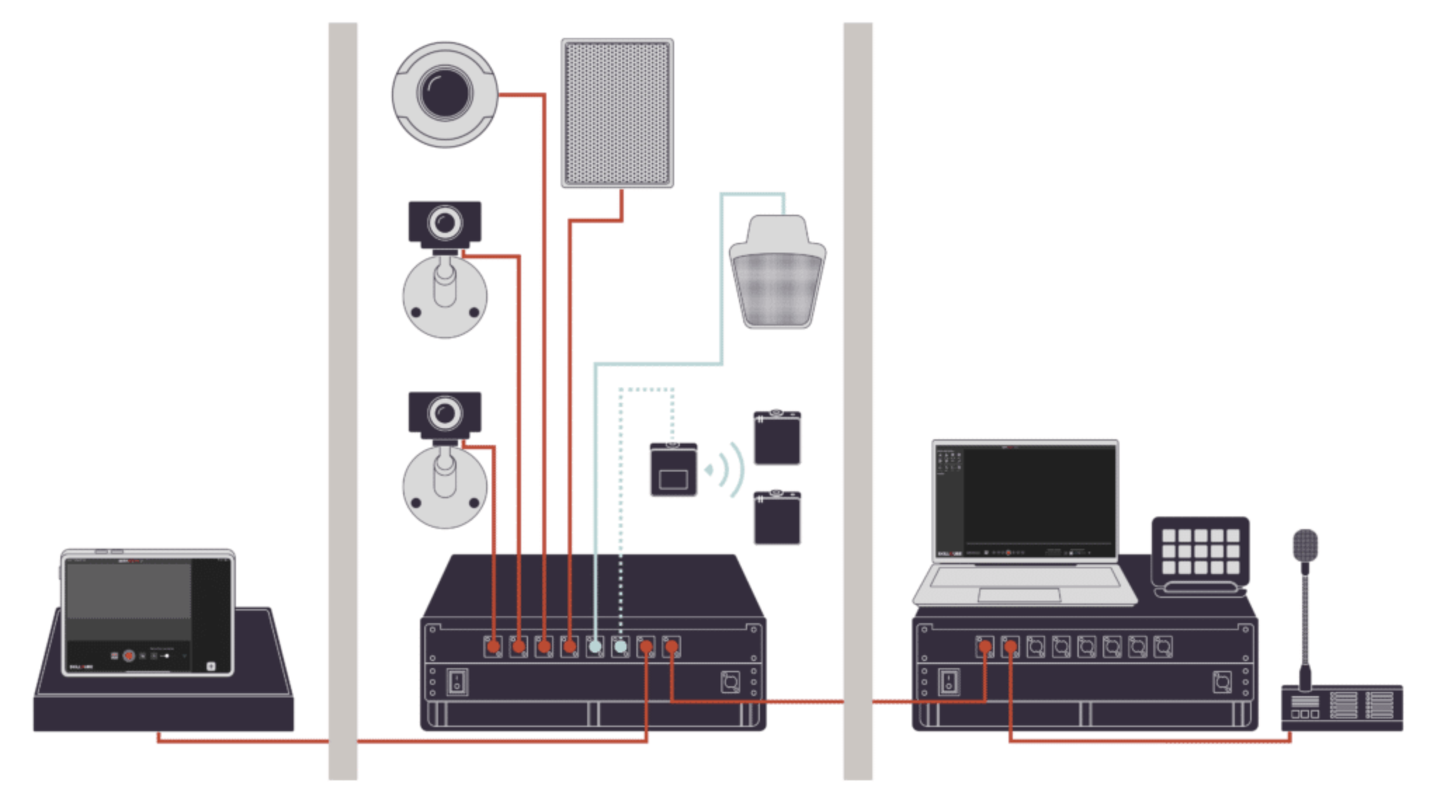 Ce module met à disposition jusqu’à 11 connexions réseau POE pour brancher des caméras IP ou des haut-parleurs réseau, ainsi que deux connexions XLR pour microphones et quatre entrées audio supplémentaires. Un total de 6 sources audio peut être géré via une table de mixage. Deux sorties audio permettent de contacter les participants — par exemple pour simuler la voix du patient ou d’une infirmière de simulation.
