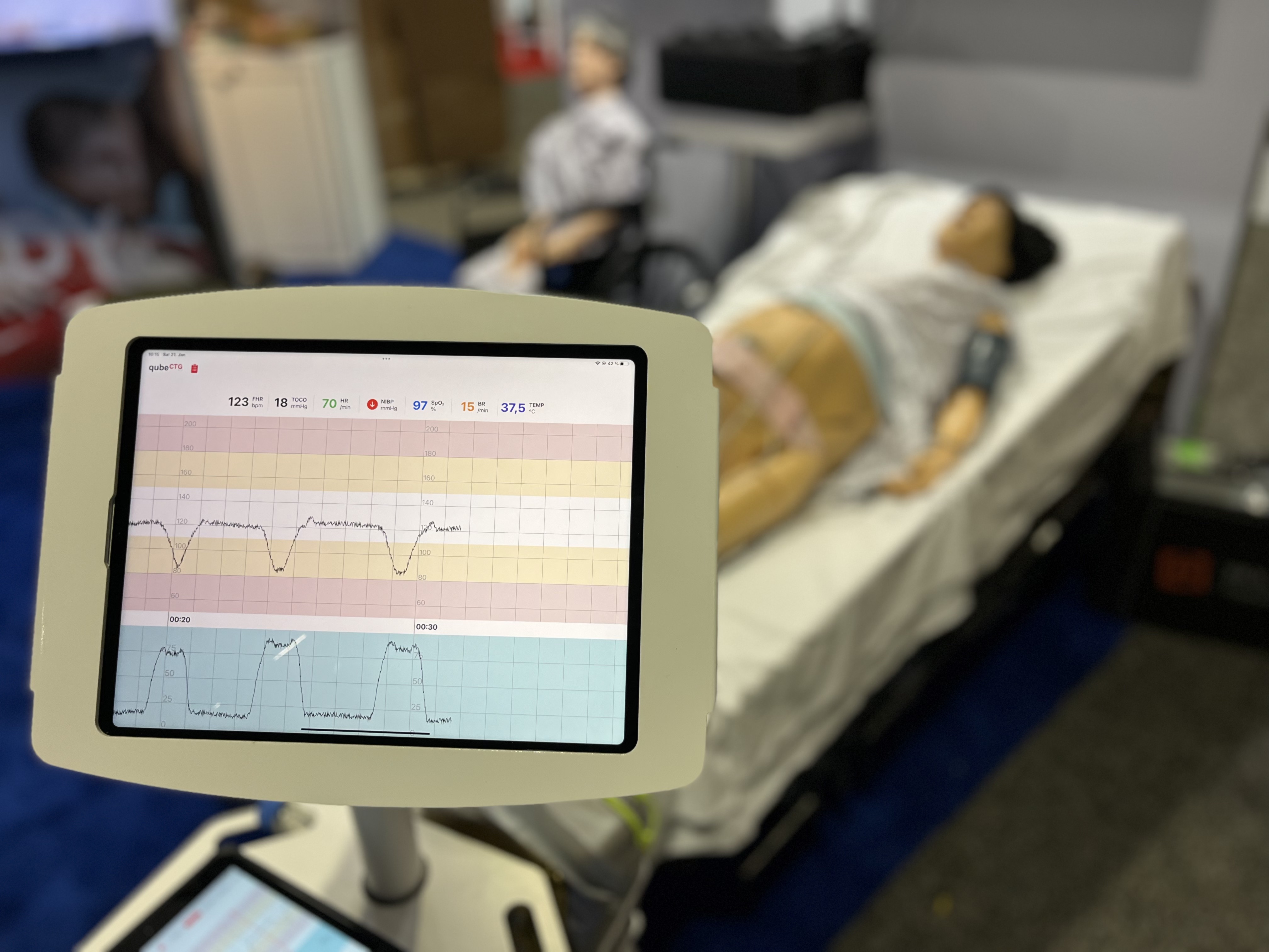 Le qubeCTG est un système de monitoring cardiotocographique en temps réel, utilisé dans des environnements de simulation obstétricale pour afficher la fréquence cardiaque fœtale et les contractions utérines maternelles lors du travail et de l’accouchement.